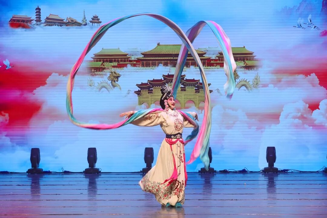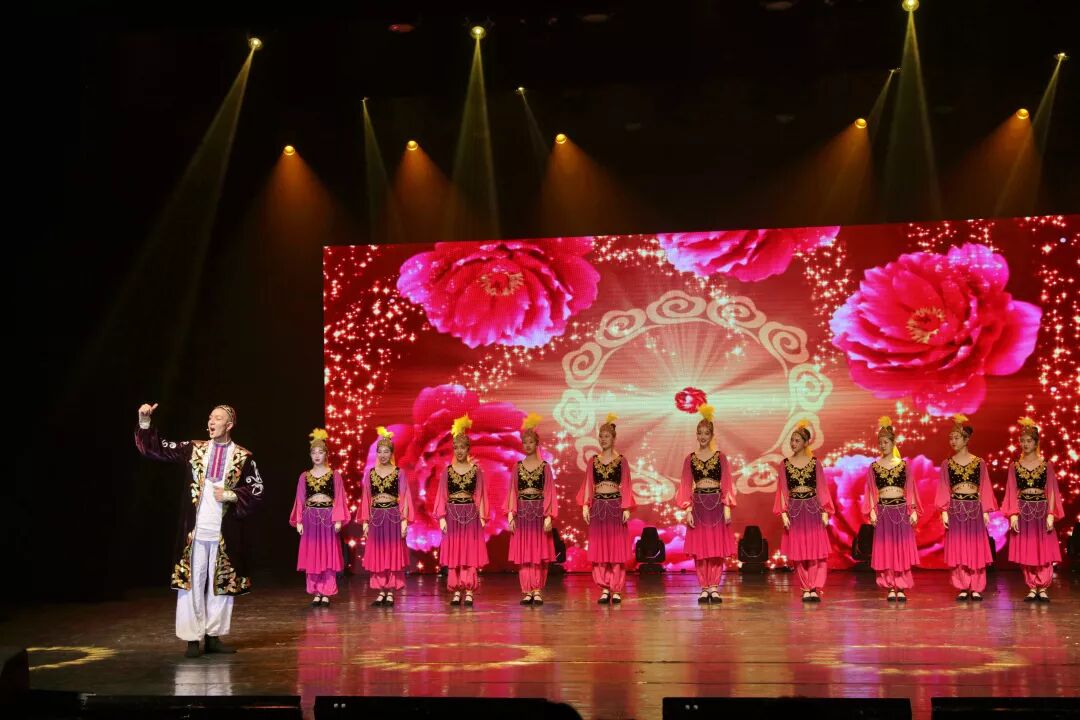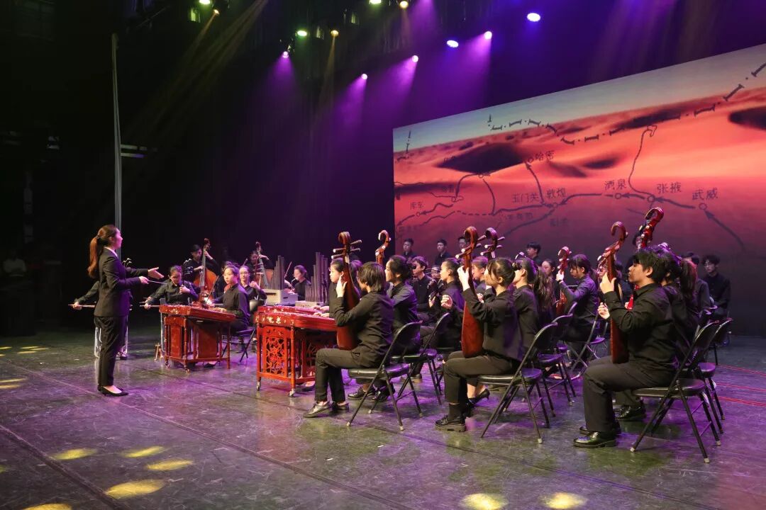 演出在民乐《丝绸之路》的演奏声中开场。这是一部表现西域风光的民乐作品,音乐色彩丰富而多变,缓慢的节奏好像描写驼队在计算着耐力步步前行,一会儿又急管繁弦,如同沙漠中吹起一阵紧似一阵的劲风。优美的音乐引动观众用想象力来填满观感,其浓郁的西域音乐特征与现代演奏技法交相辉映,听来催人奋进、凝心聚力。
