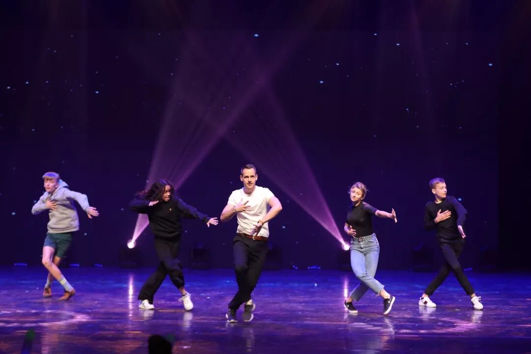 帅气的Daniel老师领着丹麦同学上场了,为观众们带来活力四射的舞蹈。舞台上时不时闪现出机械的声响,好像为舞者装上了不知疲倦的增压引擎,让舞姿看起来酷感十足,台下观众的心跳和脉搏也加足了油门,跟着台上的舞者一起狂奔。