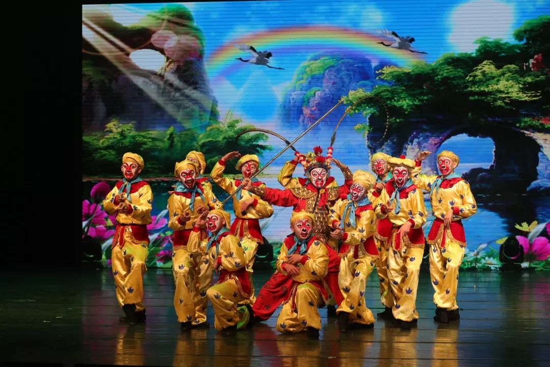 京剧《金猴腾跃》开场新颖有趣,一群小猴从台下涌出,将观众们带入青翠可爱的洞天福地,花样百出的跟头飞脚玩得别出心裁,得心应手。一会儿美猴王上场大展身手,操练手下兵将。舞台上小猴们活泼天真,美猴王正义果敢,精进健动的纯阳气象腾跃而出。