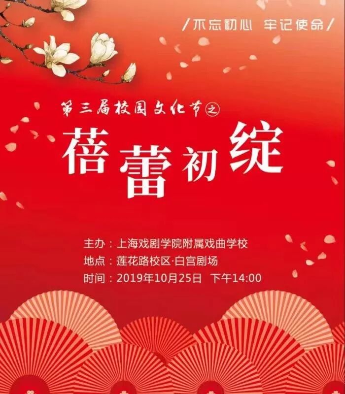 2019年10月25日,戏校第三届校园文化节之“蓓蕾初绽”在白宫剧场隆重上演。整场演出如同一场盛大的家宴,由戏校师生精心准备的14道节目组成,舞台上上演的是平日里一块儿排练的节目,台下坐着的是朝夕相处的伙伴,孩子们放开了拘束,尽情享受这场集体的狂欢。