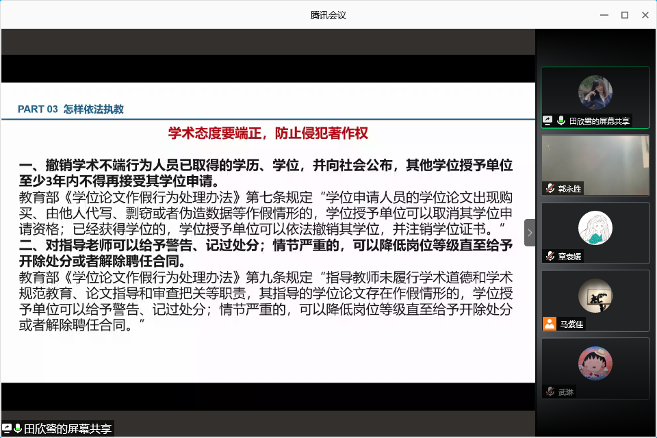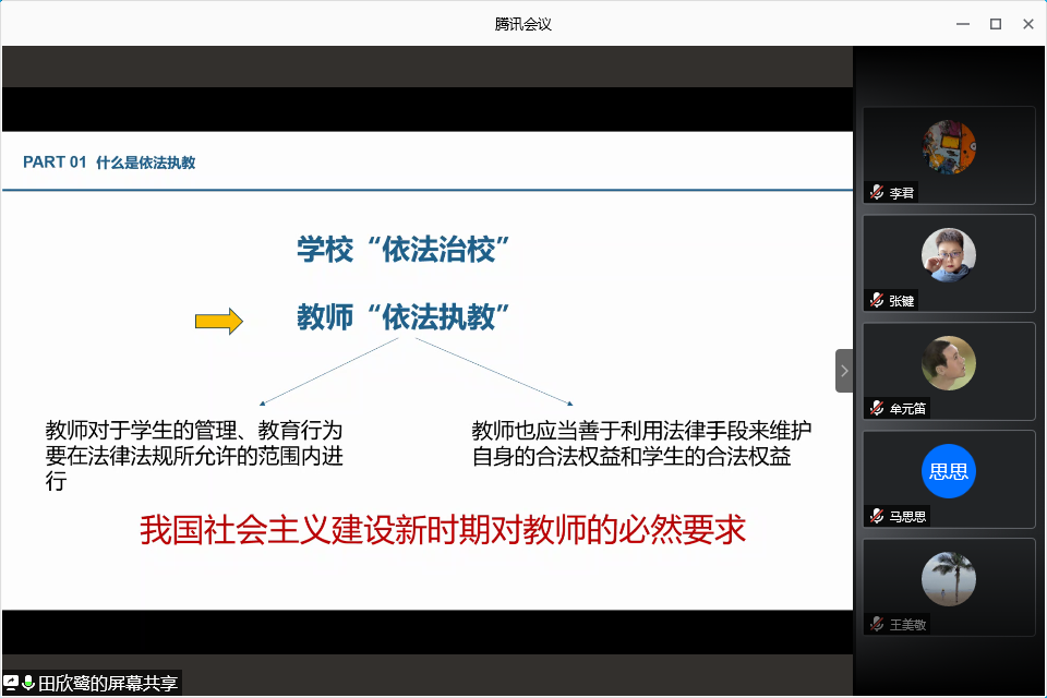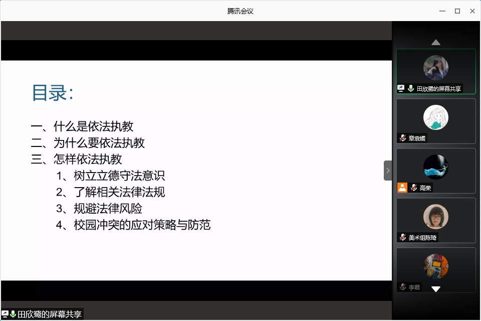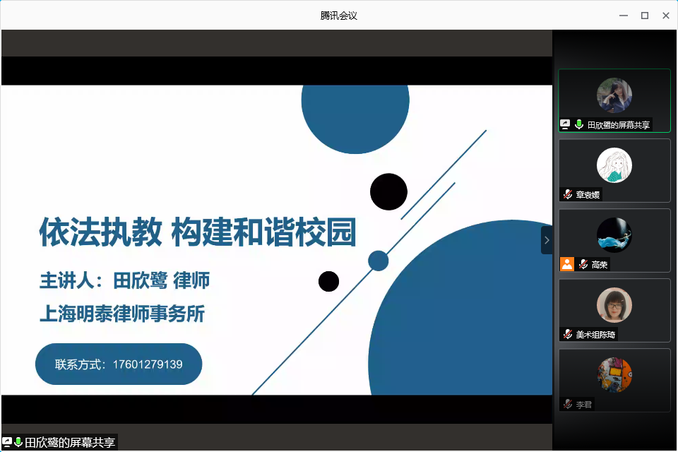 10月16日下午三点,一场特别的教师线上培训讲座通过云课堂启幕,由我校研训中心主办特邀明泰律师事务所田欣鹭律师,为全校教职工带来一场看似遥远实则与人息息相关的法制教育——《依法执教,构建和谐校园》。全校教师如约相聚,共享集学术性与实用性为一体的法律讲座。