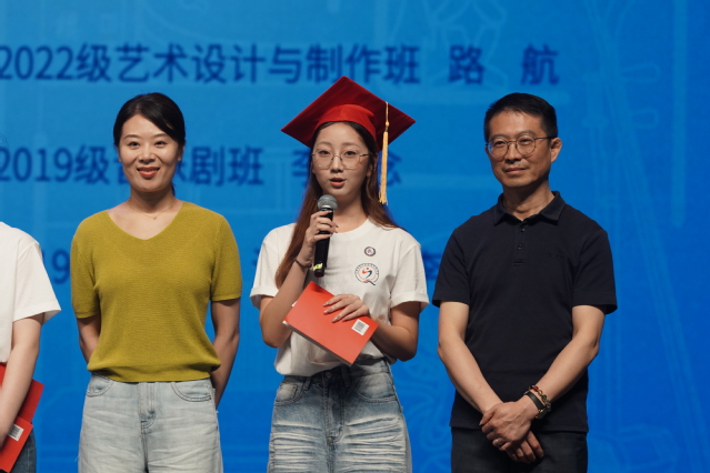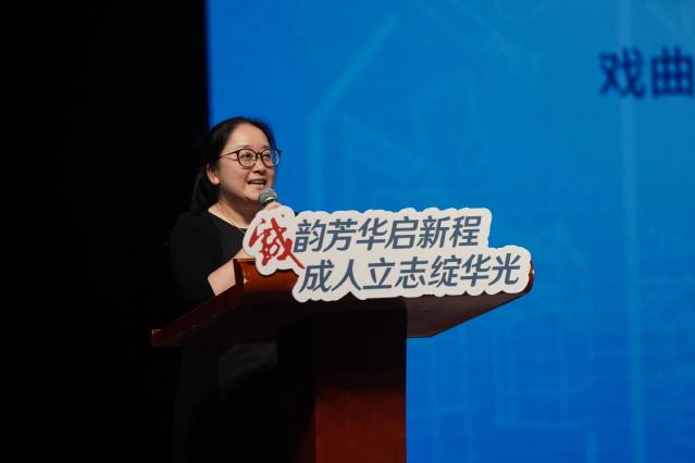 戏曲音乐教研室副主任丁佳老师作为本次毕业典礼的教师代表发言。丁老师很高兴能见证同学们这六年的成长,她表示,每一位同学都是中国传统艺术的学习者、继承者,也为同学们所取得的成绩感到骄傲。她为即将展翅高飞的学子们送上谆谆嘱托和真挚祝福,勉励大家传承戏曲艺术,勇担时代使命。