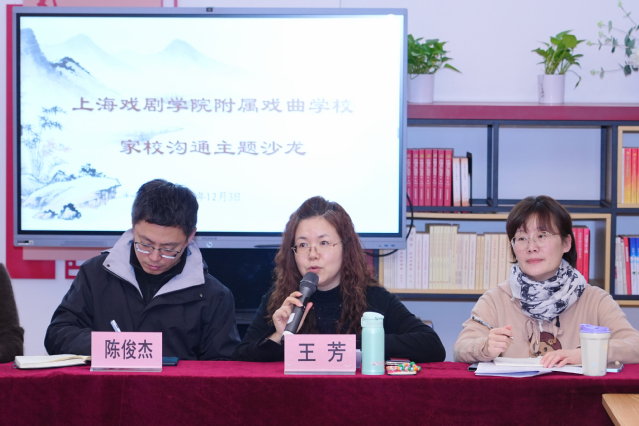 第一组沙龙由我校党总支副书记、副校长王芳主持,副校长陈俊杰、教导科科长李美、团委书记王璐、音乐剧教研室主任陆保程、淮剧教研室主任梁仲平、沪剧教研室主任金玉明、文化教研室副主任王丽娟、京剧教研室副主任季永鑫、相关班级班主任老师及家长们共同出席。