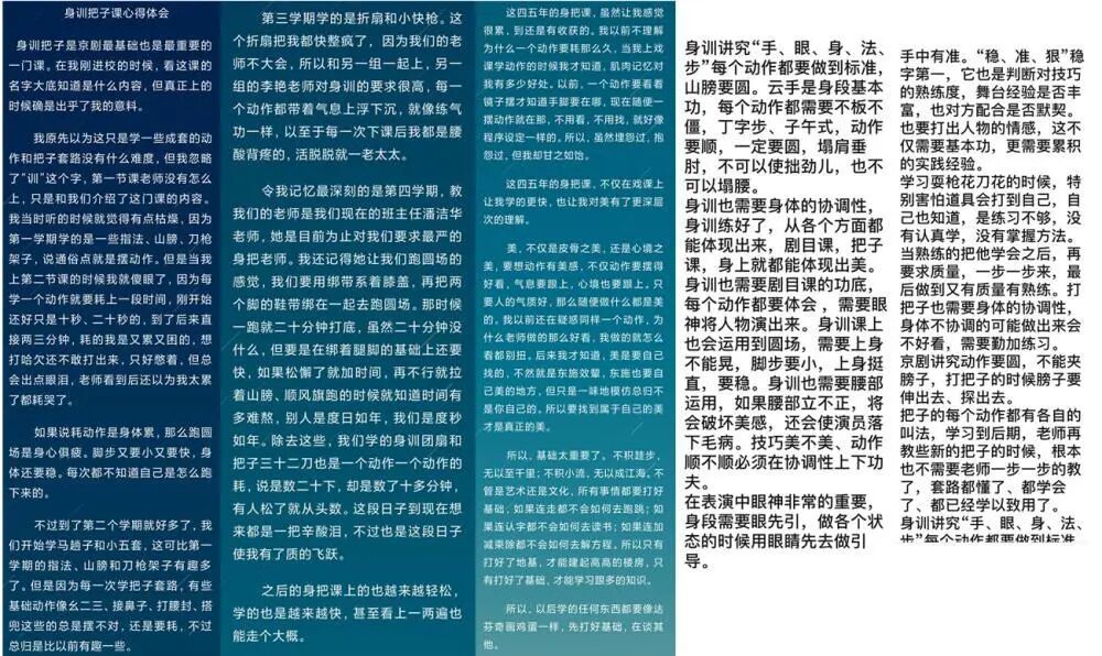 基本功组老师充分调动学生的积极性。基本功、毯子功等教学受场地、道具等限制,学生们开动脑筋,利用家中一切的资源充当道具,庭院、山坡地、乡村路、停车场变身为练功场。