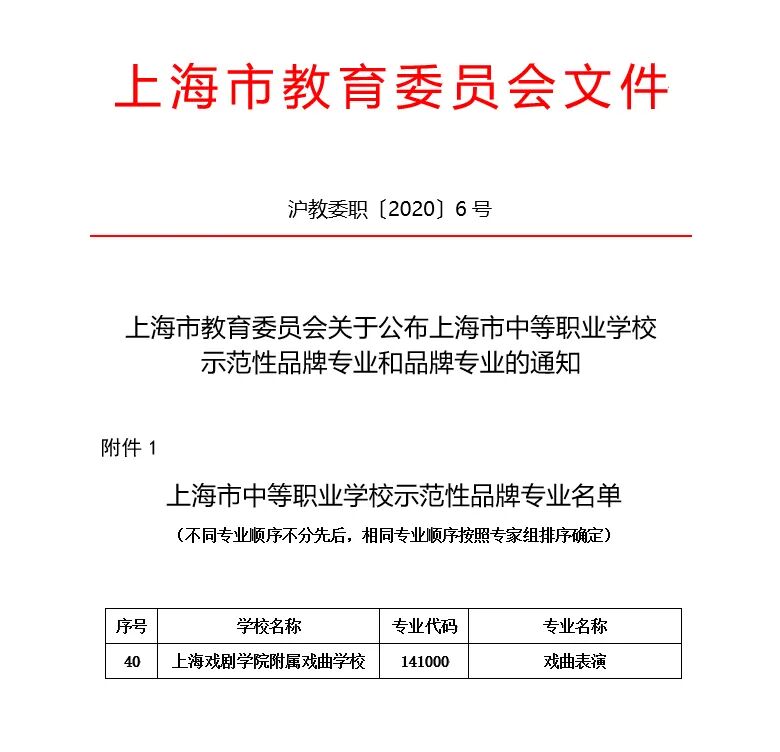 根据《上海市教育委员会关于印发<上海市中等职业学校示范性品牌专业和品牌专业建设验收评估实施方案>的通知》(沪教委职〔2019〕16号)、《上海市教育委员会关于开展上海市中等职业学校示范性品牌专业和品牌专业创建工作的通知》(沪教委职〔2016〕9号)和《上海市教育委员会关于公布上海市中等职业学校示范性品牌专业和品牌专业立项建设项目名单的通知》(沪教委职〔2016〕21号)的要求,通过学校自评、专家网上材料评审、集中汇报答辩评审、实地抽查和综合评议等环节,经市教委研究,42个专业为上海市中等职业学校示范性品牌专业,68个专业为上海市中等职业学校品牌专业,我校戏曲表演专业荣登上海市中等职业学校示范性品牌专业榜。