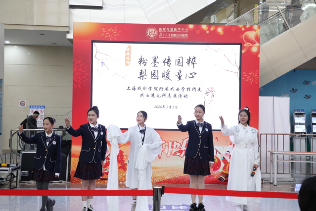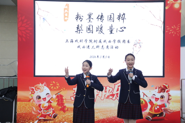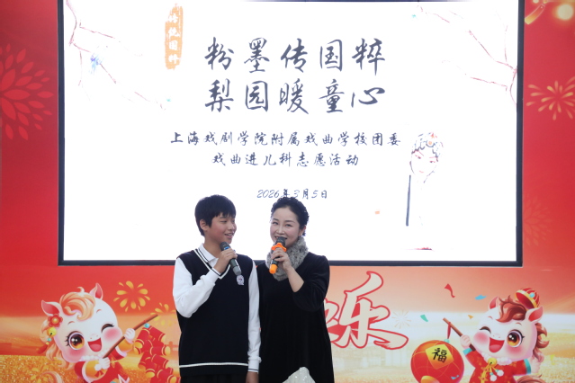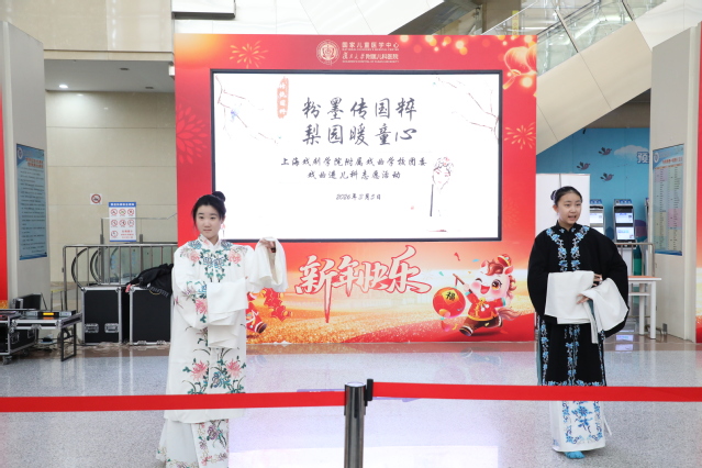 与此同时,我校党总支副书记、副校长王芳带领校团委组织的12名师生前往复旦大学附属儿科医院,为就诊患儿及家长献上了一场精心筹备的“粉墨传国粹,梨园暖童心”专场演出。复旦大学附属儿科医院门诊大厅里悠扬的戏曲声响起,吸引了不少候诊的家长与孩子驻足欣赏。本次演出集结了我校多个特色专业的力量,涵盖多种剧种,淮剧《牙痕记》、京剧《上天台》、沪剧《唱支山歌给党听》、越剧《红星闪闪·越来越好》以及歌曲《世界赠予我的》等精彩节目轮番上演。除了充满朝气的学生演员,还有师生同台联袂献唱,让平日忙碌的诊区多了几分艺术的温度。候诊的家长们也纷纷拿出手机,记录下这难得的温馨时刻。